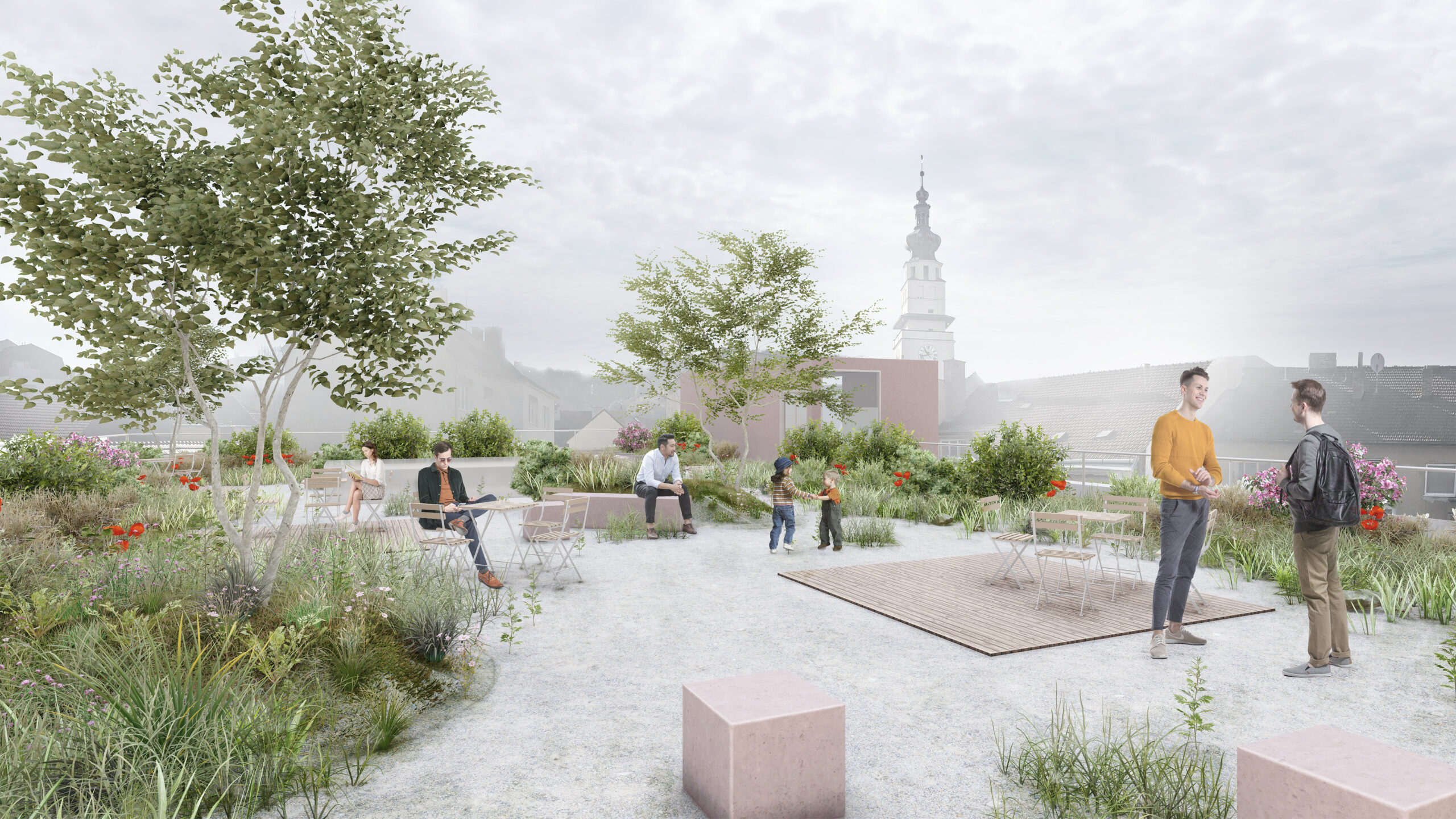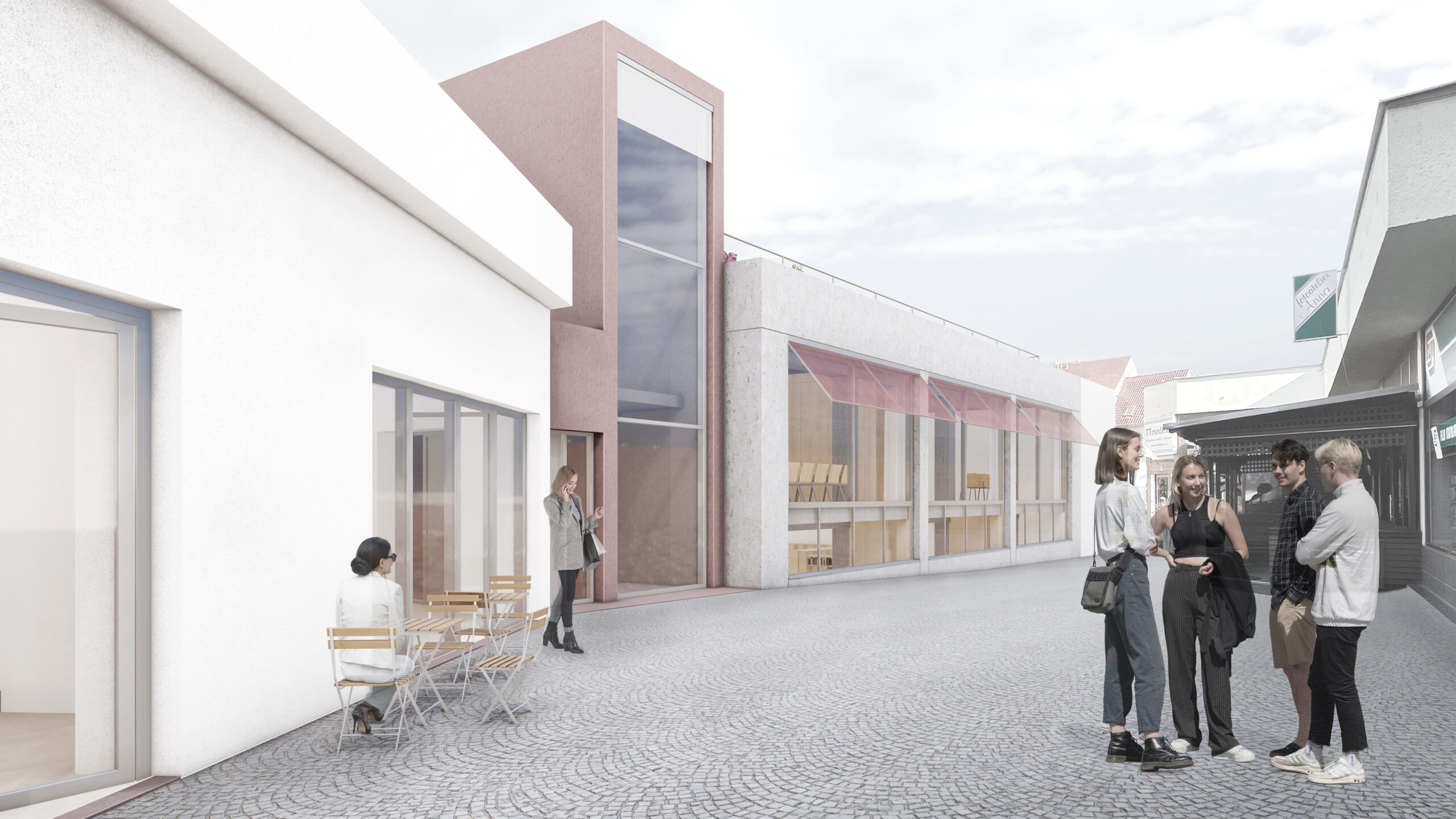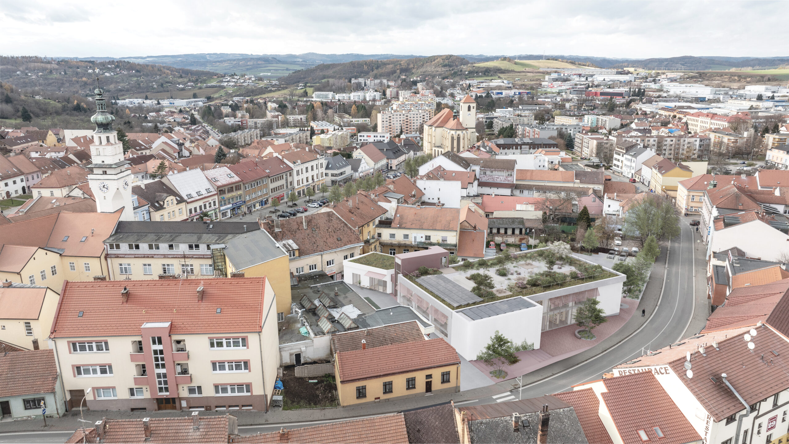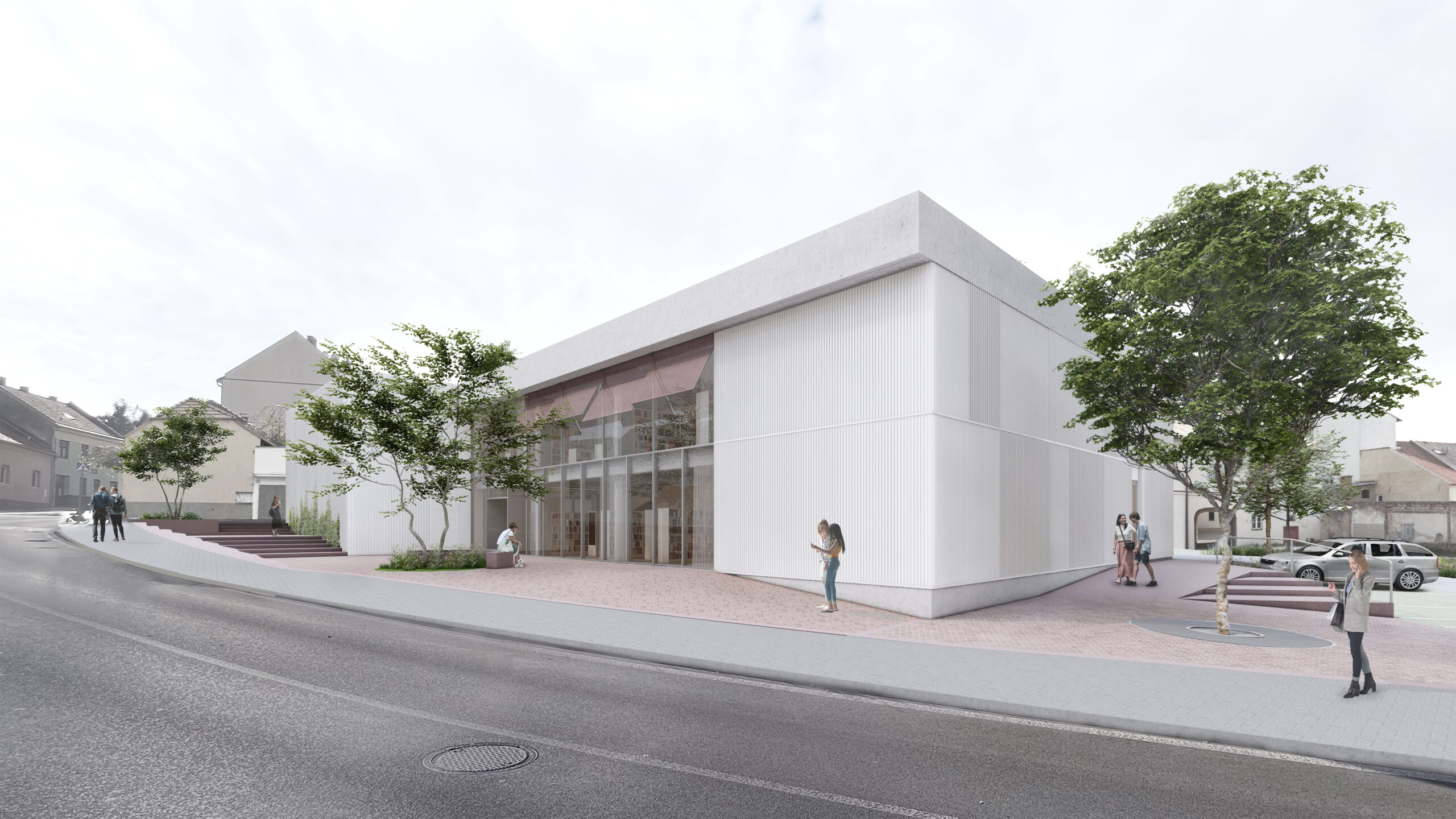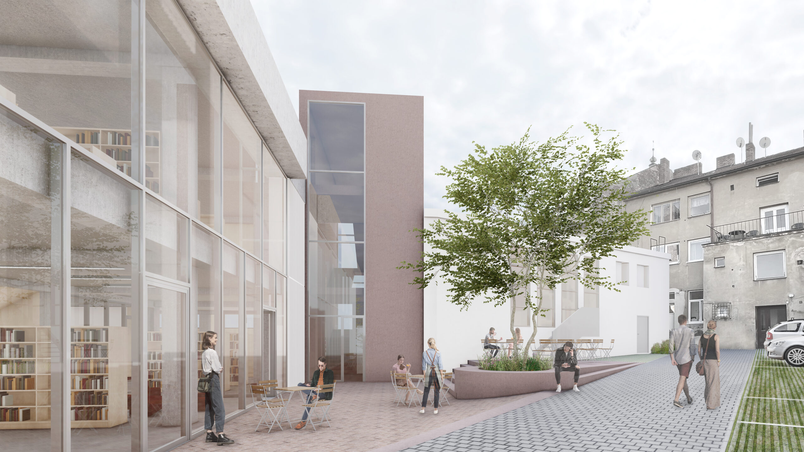 Koncept je dán vztahem městských prostor a provozní struktury domu. Po obvodu dotváříme škálu městotvorných prostranství. Provozně vydělujeme dva objemy, kotelnu adaptujeme na bistro se zázemím a prodejnu na knihovnu. Tyto celky propojujeme novým komunikačním jádrem. Forma vychází z původní konstrukční podstaty s nově pojednanou obálkou, která se ve shodě s interiérem a městským exteriérem otevírá nebo uzavírá.